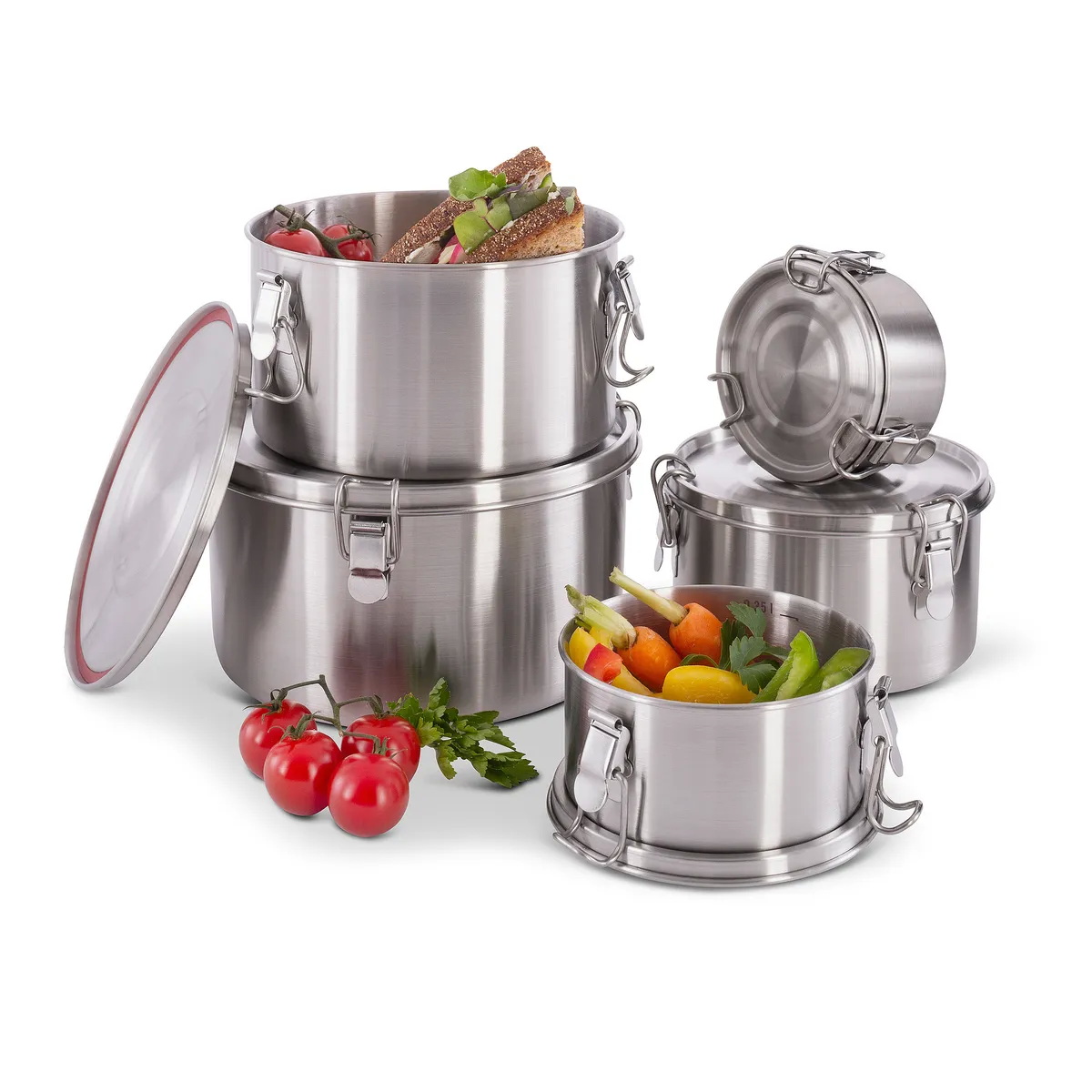 Набор из 5 контейнеров для пищевых продуктов. Контейнеры выполнены из нержавеющей стали, оснащены механизмом запирания и силиконовыми уплотняющими кольцами на крышках.