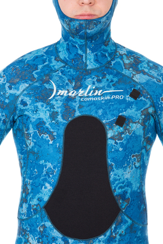 Гидрокостюм Marlin Camoskin Pro (Марлин Камоскин Про) – обновленная модель гидрокостюма Camoskin. При производстве данной модели используются различные виды неопрена и тканевые материалы ведущего мирового производителя - фирмы Шейко. Совершенный анатомический крой гидрокостюма состоит из 49 деталей, что делает его максимально удобным при длительной эксплуатации. Куртка имеет крой типа реглан, который увеличивает комфорт и создаёт максимальное прилегание гидрокостюма. Нагрудник (упор для зарядки ружей), вшитый в гидрокостюм, в отличие от приклеенных аналогов, исключает отрывание его в процессе эксплуатации. На шлеме, в районе ушей, имеются вставки из дублированного неопрена – для устранения присасывания шлема к ушам. В отличие от своего предшественника, костюм модели Camoskin Pro получил вставки камуфлированного окраса. Обтюраторы из материала smooth skin (смус скин) на ногах, руках и шлеме предотвращают попадание воды внутрь гидрокостюма и также имеют камуфлированный окрас.
