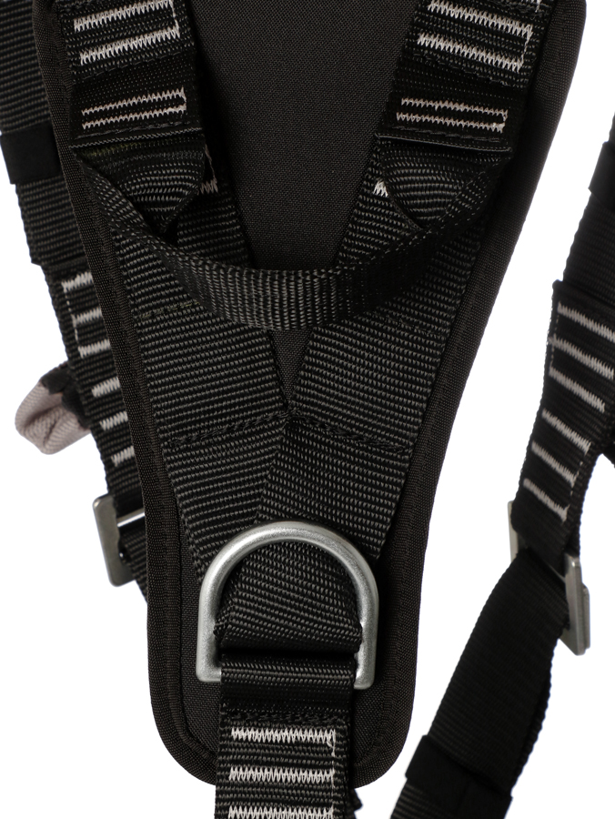 Точки крепления страховочной веревки: заниженная поясная, регулируемая по высоте грудная и дополнительная точка на спине. Быстрозатягивающиеся разъемные регулировочные пряжки. Широкие накладки на поясных и ножных ремнях для большего комфорта. Эвакуационная ручка на спине.